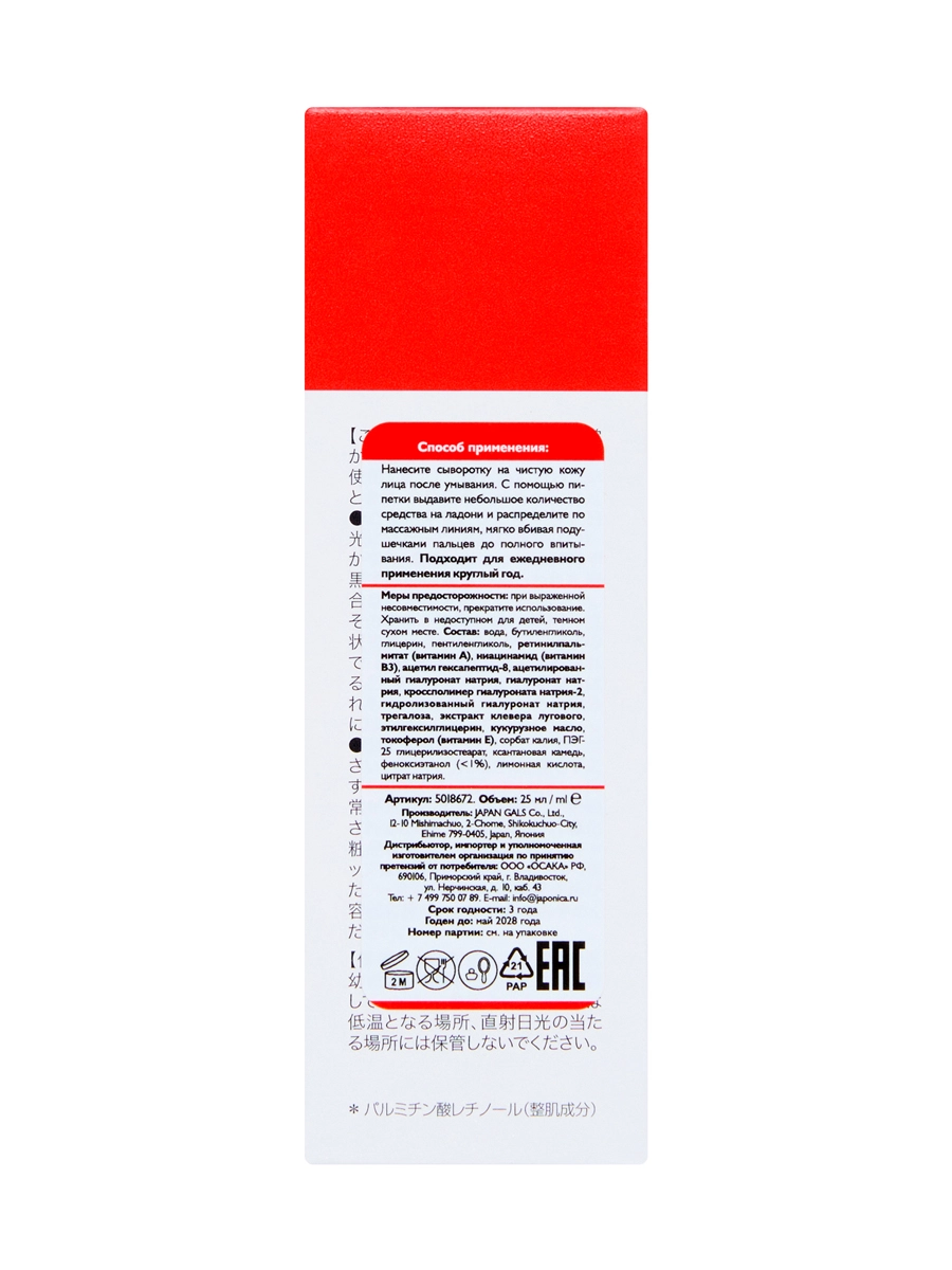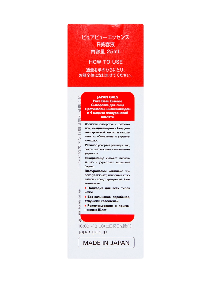 JAPAN GALS Pure Beau Essence Сыворотка для лица с ретинолом, ниацинамидом и 4 видами гиалуроновой кислоты, 25 мл