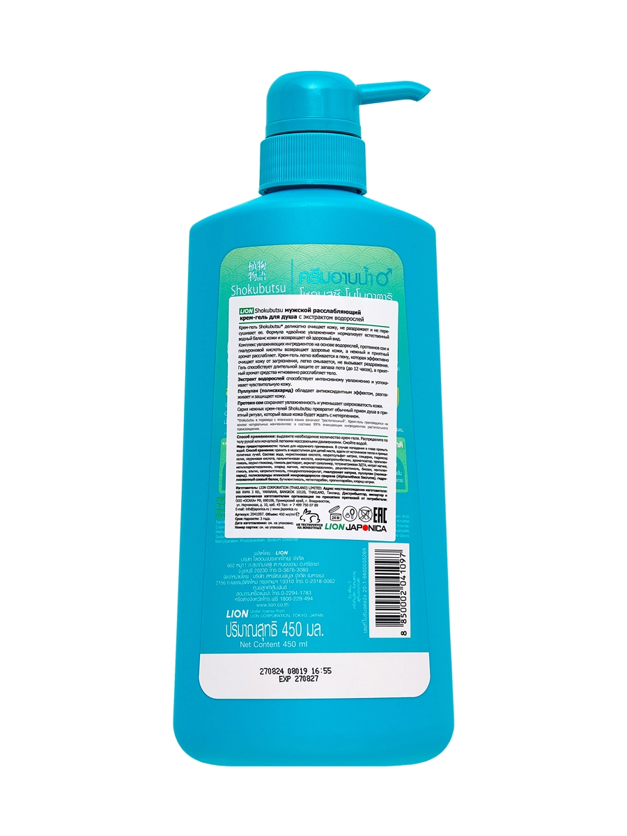 LION Shokubutsu Мужской расслабляющий крем-гель для душа с экстрактом водорослей, 450 мл