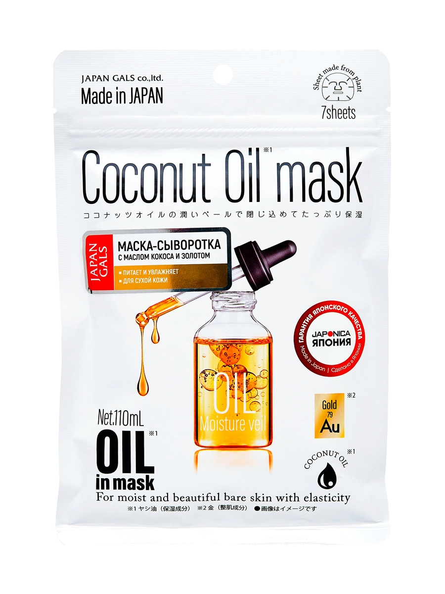 Недельный курс японских тканевых масок-сывороток для лица Japan Gals с кокосовым маслом и золотом. Главное свойство масок - увлажнение. Подходят для сухой и обезвоженной кожи. Можно применять в любое время суток: утром маски станут заменой увлажняющему крему, сыворотке и базе под макияж, вечером - глубокому уходу.