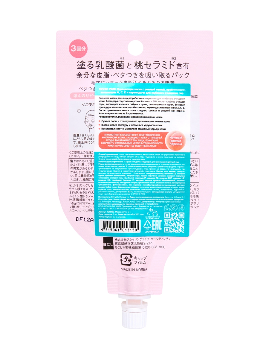 Японская очищающая маска для лица Momo Puri с розовой глиной, пробиотиками, керамидами, витаминами А, С, Е. Рекомендуется для комбинированной и жирной кожи.