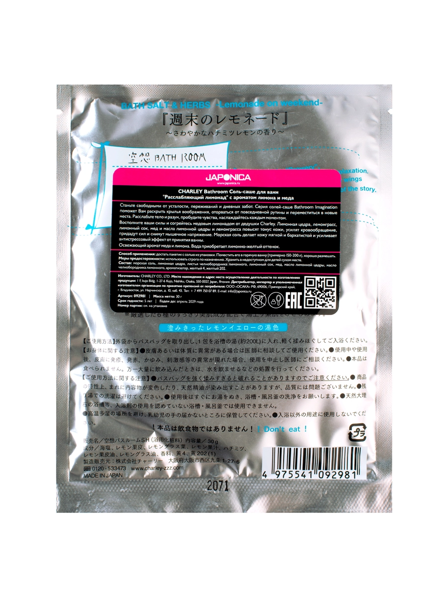 Соль-саше для ванны "расслабляющий лимонад" с ароматом лимона и меда, 30 г